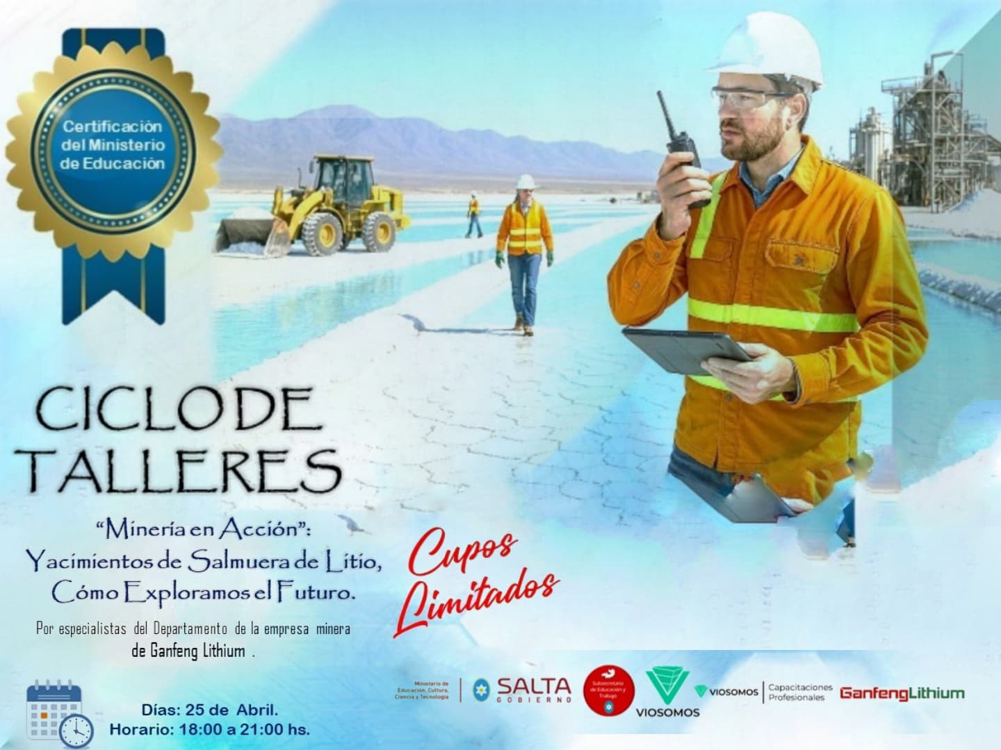La Subsecretaría de Educación y Trabajo de la Provincia de Salta, en conjunto con la Consultora Geológica de Formación Minera Viosomos, invita a estudiantes, profesionales jóvenes y público general a participar en el taller teórico-práctico titulado “Yacimientos de Salmuera de Litio: Cómo Exploramos el Futuro”, que se llevará a cabo el próximo viernes 25 de abril, de 18:00 a 21:00 hs, en el Polo Agrotecnológico de Salta.