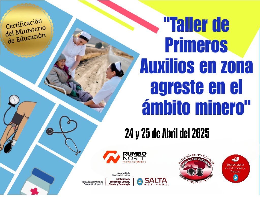 En el marco de la formación técnica y con el objetivo de brindar herramientas clave para actuar ante emergencias en contextos rurales y mineros, se desarrollará un Taller de Primeros Auxilios en zona Agreste en el Ámbito Minero, organizado en conjunto con la Dirección de Educación Superior, y la Agrupación de Profesionales “Señor y Virgen del Milagro” (Amigos de los Peregrinos)