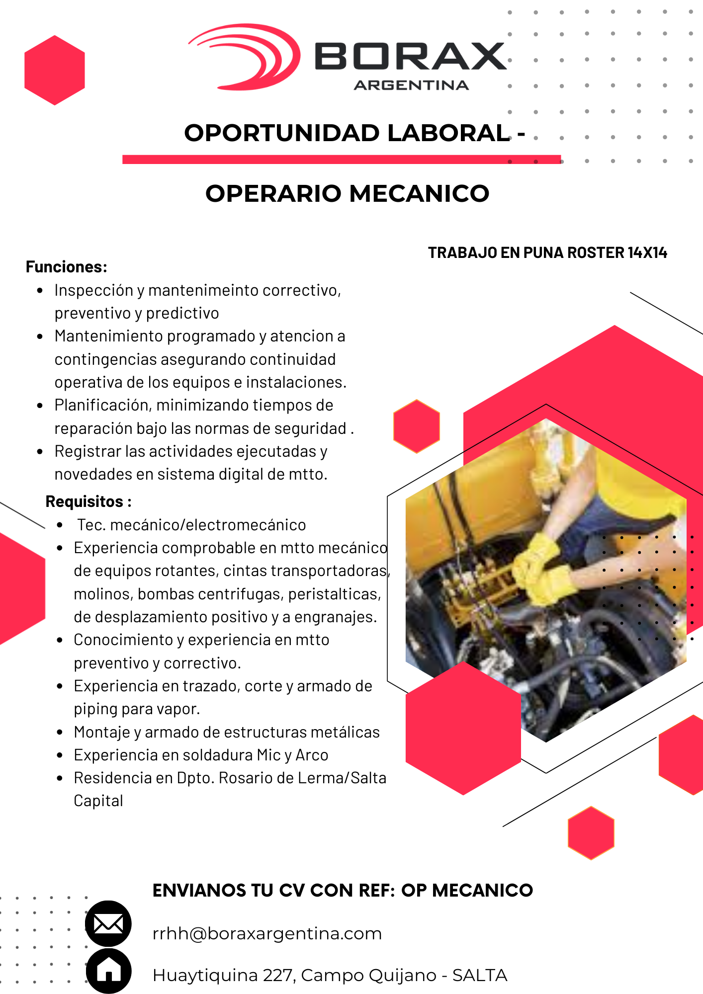 * Experiencia comprobable en mtto mecánico de equipos rotantes, cintas transportadoras, molinos, bombas centrifugas, peristalticas, de desplazamiento positivo y a engranajes.