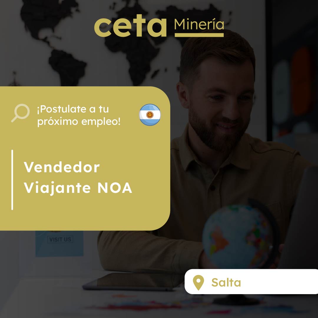 En Ceta Capital Humano – División Minería estamos buscando un/a Vendedor/a Viajante para sumarse de manera inmediata a una importante empresa del rubro de maquinaria pesada, con foco en el sector minero y de la construcción, ubicada en Salta, para desarrollar la zona NOA
