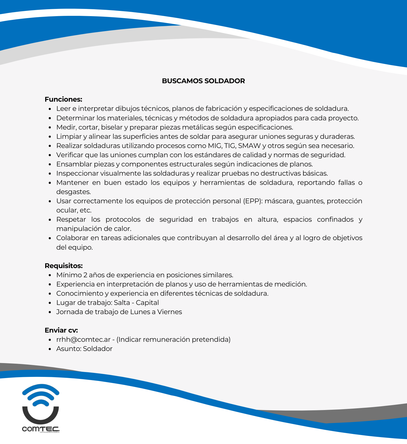 Realizar trabajos de soldadura en piezas y estructuras metálicas, asegurando la correcta ejecución según planos, normas de calidad y protocolos de seguridad, contribuyendo al correcto funcionamiento del área de producción y al cumplimiento de los objetivos de la empresa.