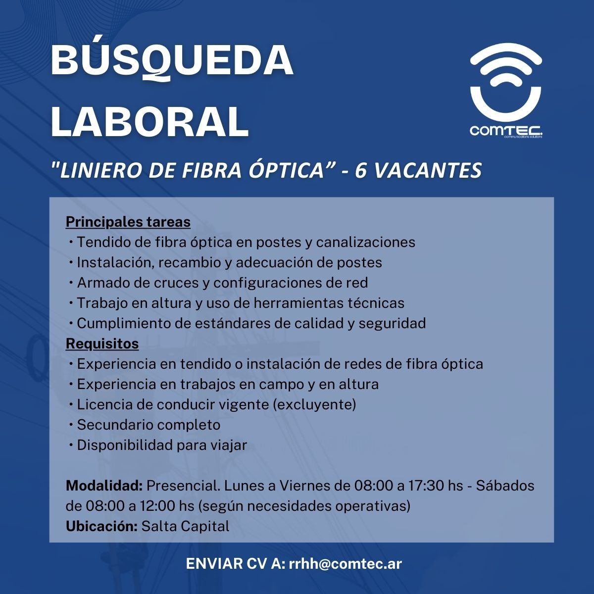 OBJETIVO DEL PUESTO: Ejecutar tareas de despliegue e instalación de redes de fibra óptica, realizando tendido en postes y canalizaciones, instalación o recambio de postes y armado de cruces, garantizando el cumplimiento de los estándares técnicos, de calidad y seguridad establecidos por la empresa.