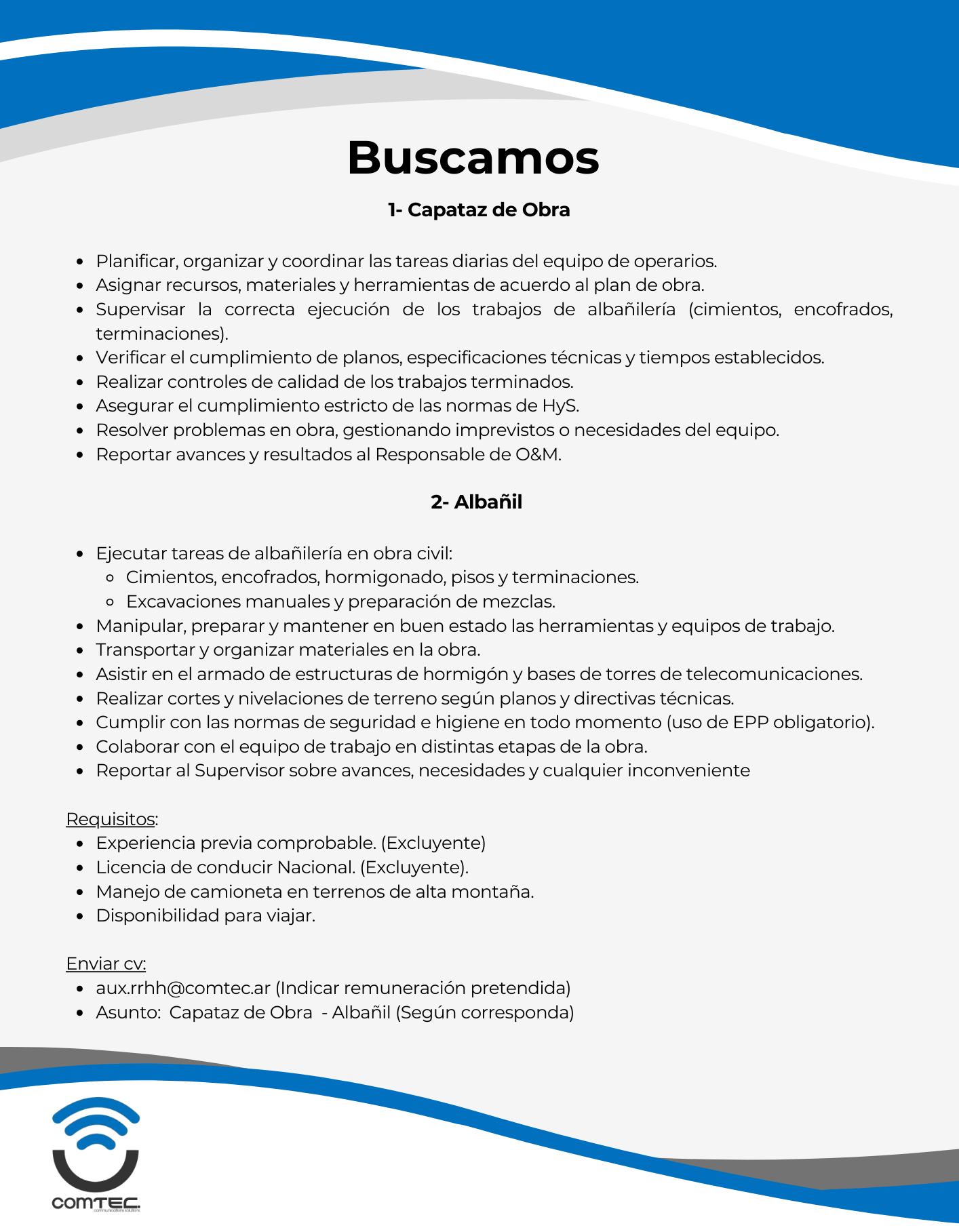 Buscamos personal para realizar trabajos de Obra Civil en Puna