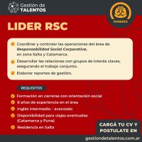 Coordinar y asegurar la estrategia del del área de RSC en las provincias de Salta y Catamarca.