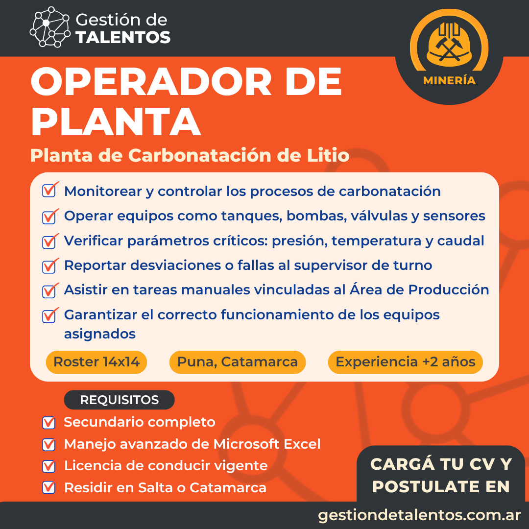 El Operador de Planta será responsable de ejecutar y supervisar las operaciones del sistema de carbonatación de litio, asegurando el cumplimiento de los parámetros técnicos y operativos establecidos, y colaborando con el equipo para mantener la eficiencia y seguridad del proceso.