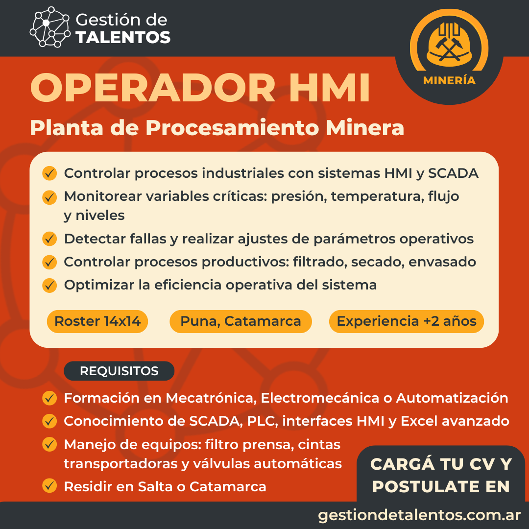 El Operador HMI será responsable de supervisar y controlar los procesos industriales en la planta de procesamiento, utilizando interfaces hombre-máquina (HMI) y sistemas SCADA. Este rol es clave para garantizar la eficiencia, seguridad y continuidad de los procesos de producción.
